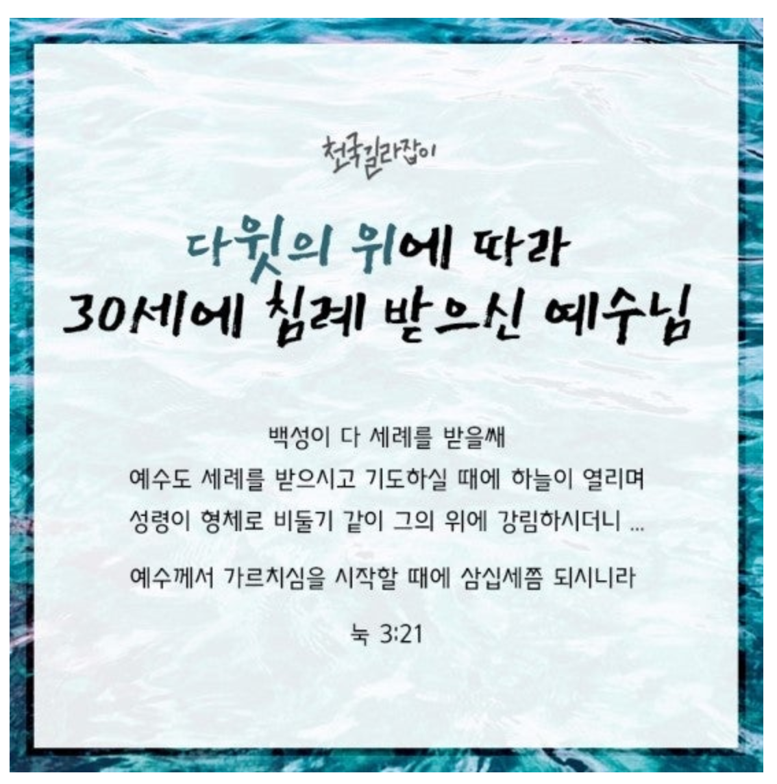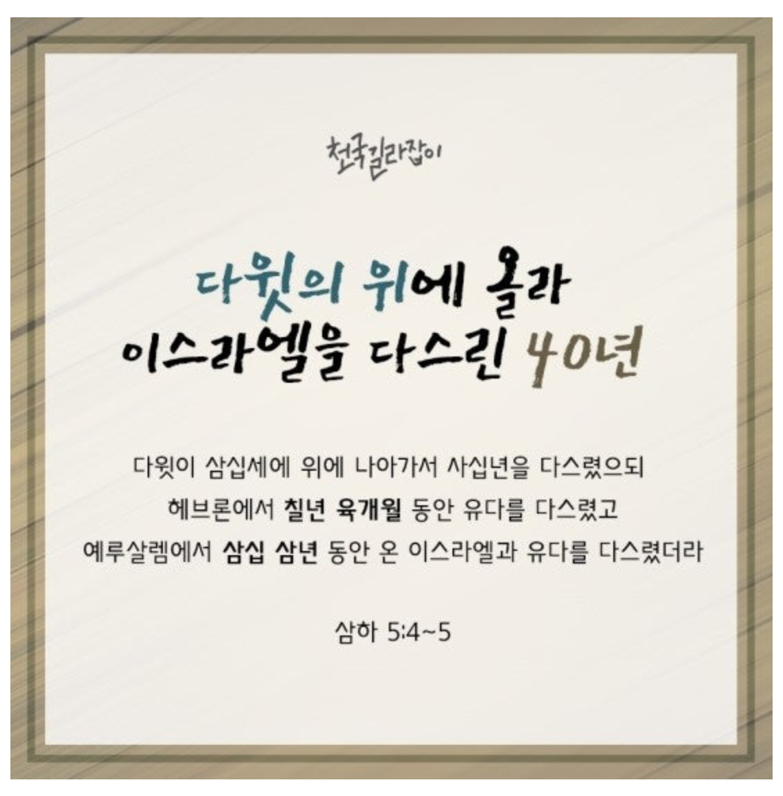 구약시대 다윗은 30세에 기름 부음을 받고 왕이 되어 40년간 통치했다. 예언적 다윗이신 예수님께서도 30세에 침례를 받고 복음 사역을 시작하셨다.