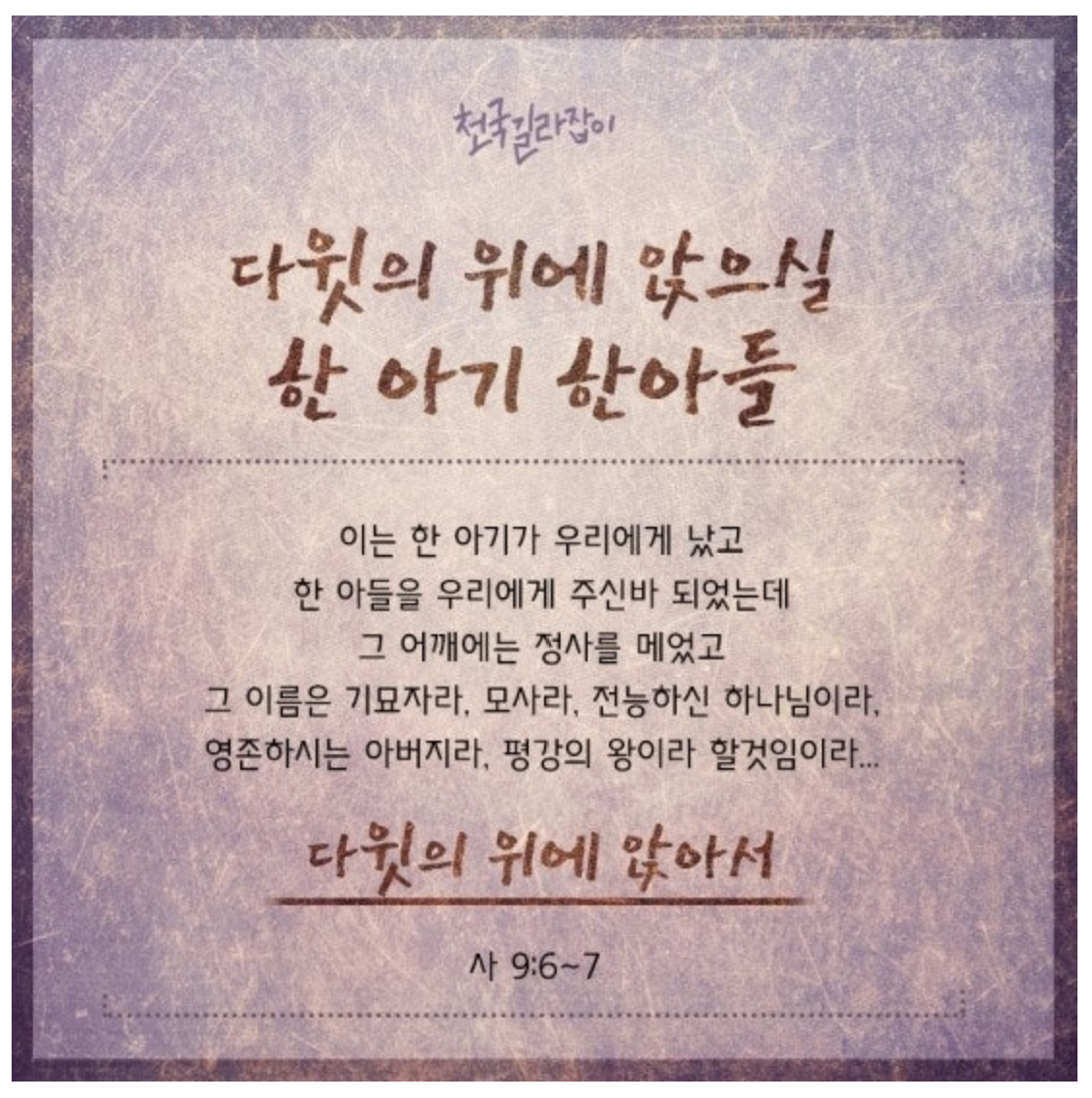 이사야 선지자는 ‘한 아기, 한 아들’로 태어나시는 하나님께서 ‘다윗의 위(왕위)’에 앉으실 것이라고 했다.