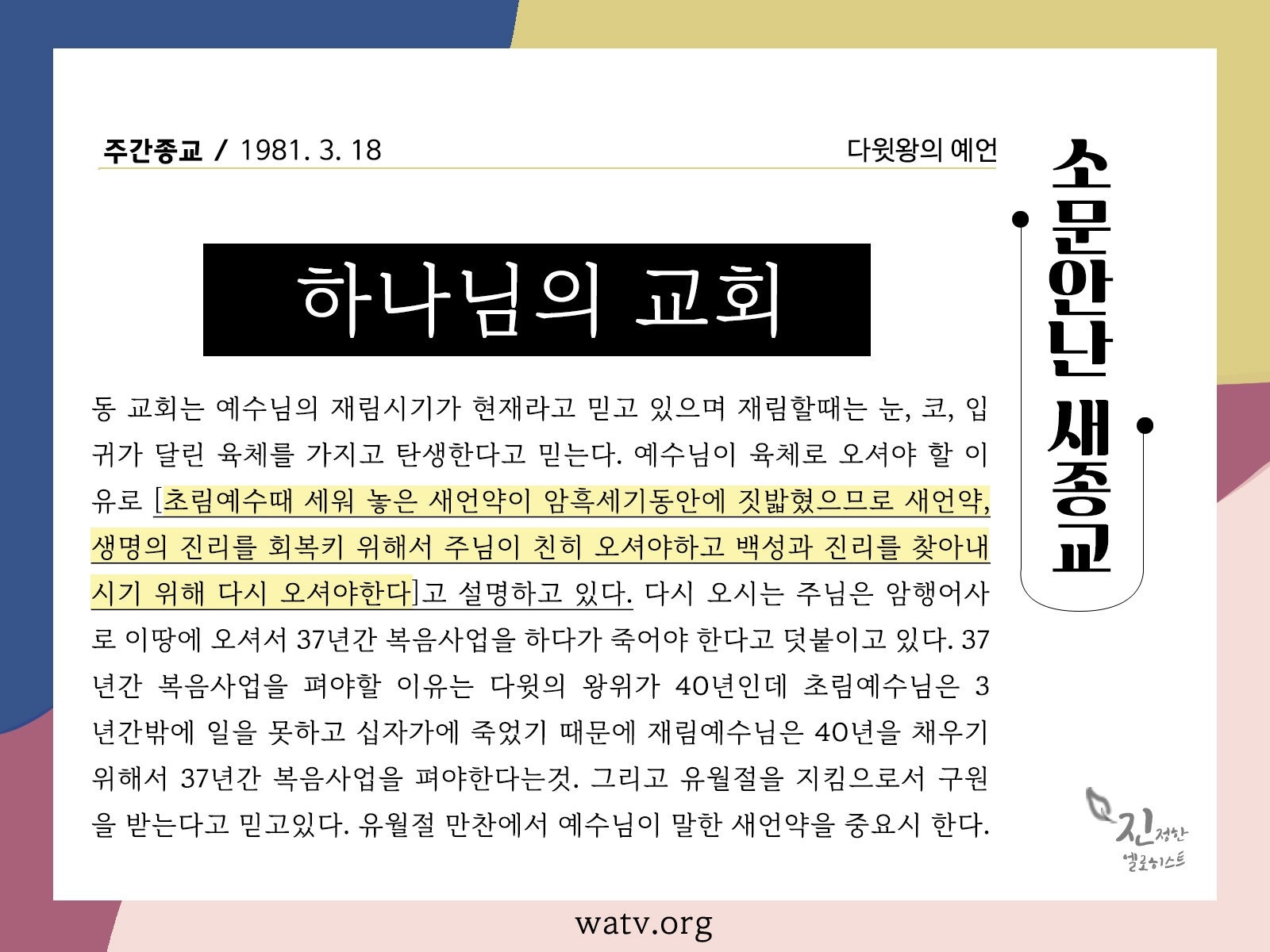 안상홍의 행적, 새 언약 유월절 복구와 37년 복음사역은 성경이 예언한 재림 그리스도, 다윗의 증거인가 - 1981년 3월 18일자 주간종교 안상홍의 인터뷰